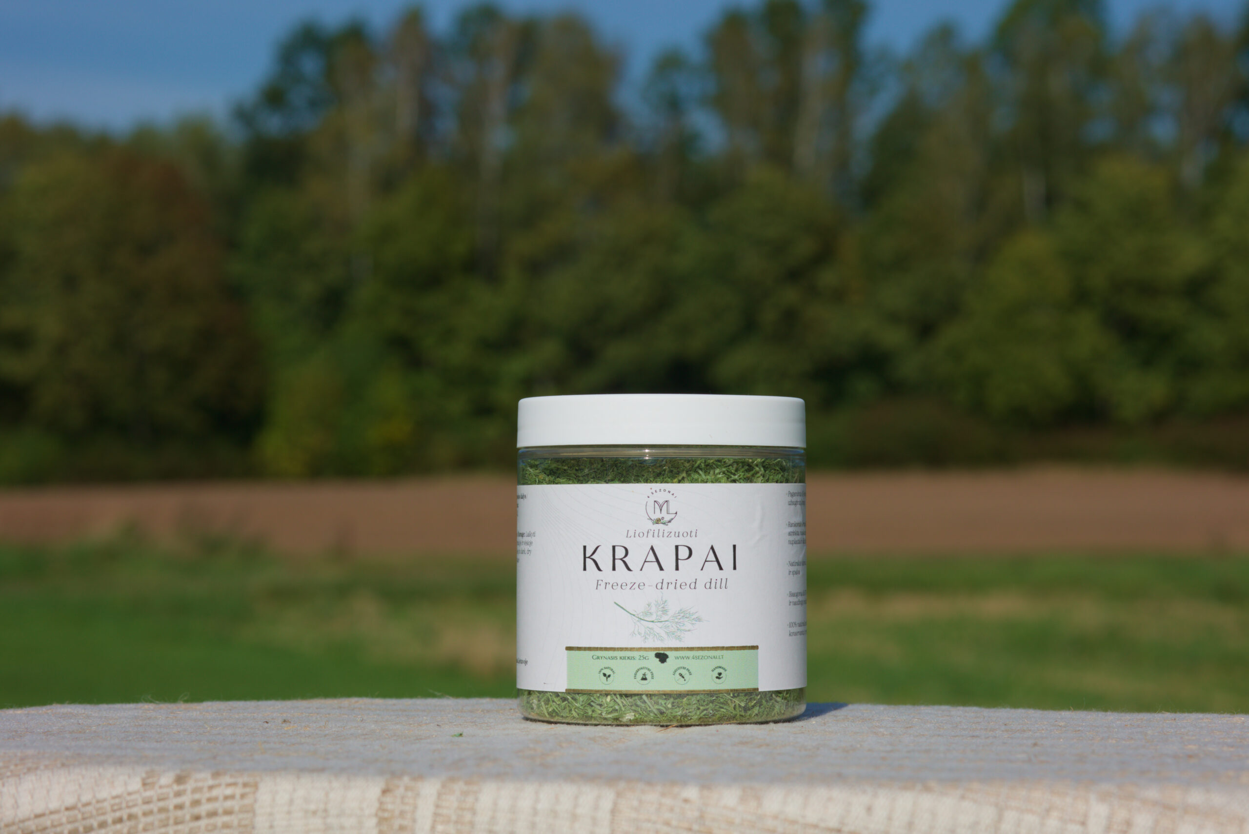 Šis produktas pagamintas iš šviežių, Lietuvoje užaugintų krapų, kurie rankomis atrinkti, nuskabyti, nuplauti ir galiausiai išliofilizuoti. Jų skonis, aromatas ir spalva visiškai natūralūs, o liofilizavimo procese išsaugoma net iki 97% vitaminų ir naudingų medžiagų.