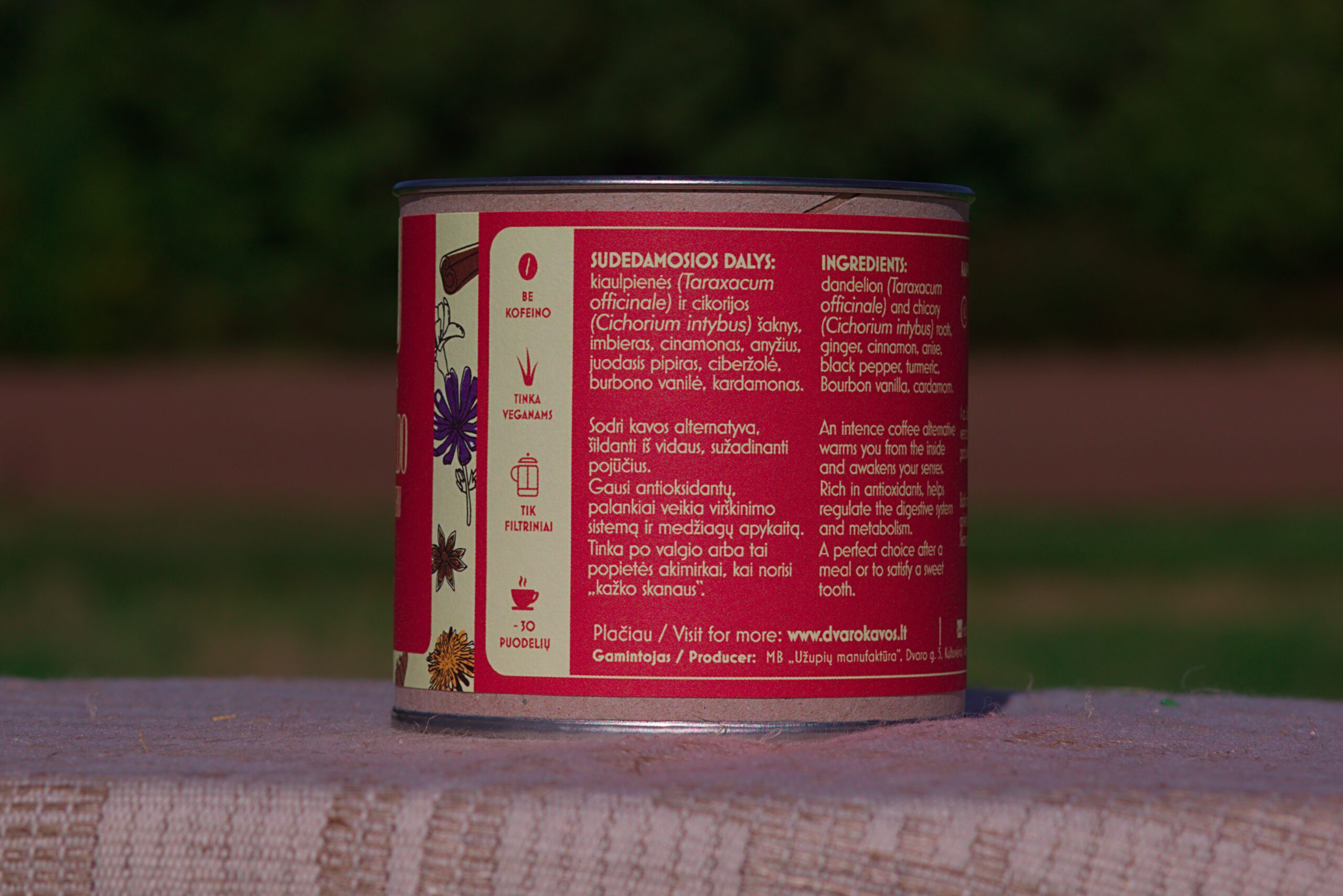 Sudėtis: švelniai skrudintos kiaulpienės (Taraxacum officinale) ir cikorijos (Cichorium intybus) šaknys, imbieras, cinamonas, anyžius, juodasis pipiras, ciberžolė, burbono vanilė, kardamonas.