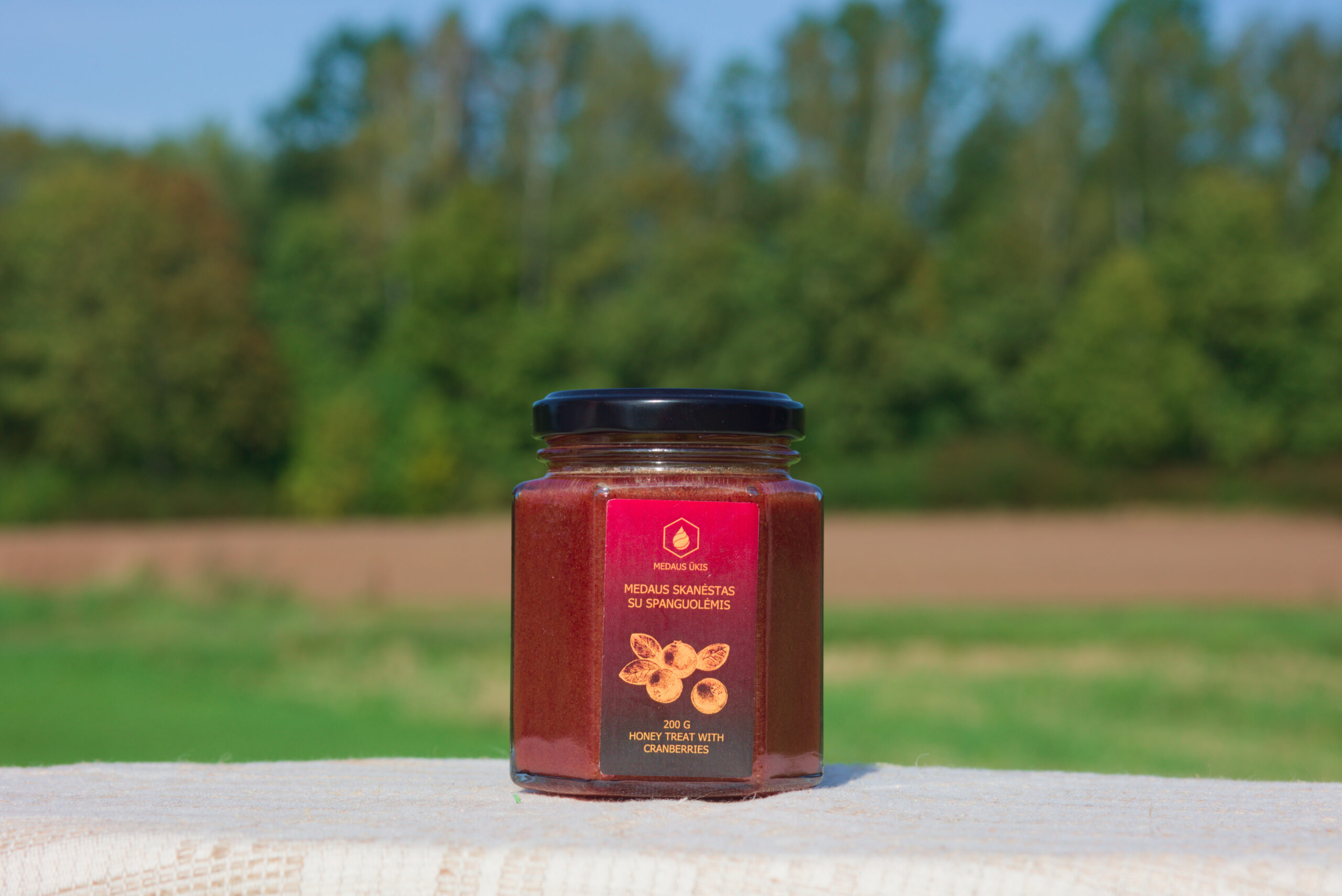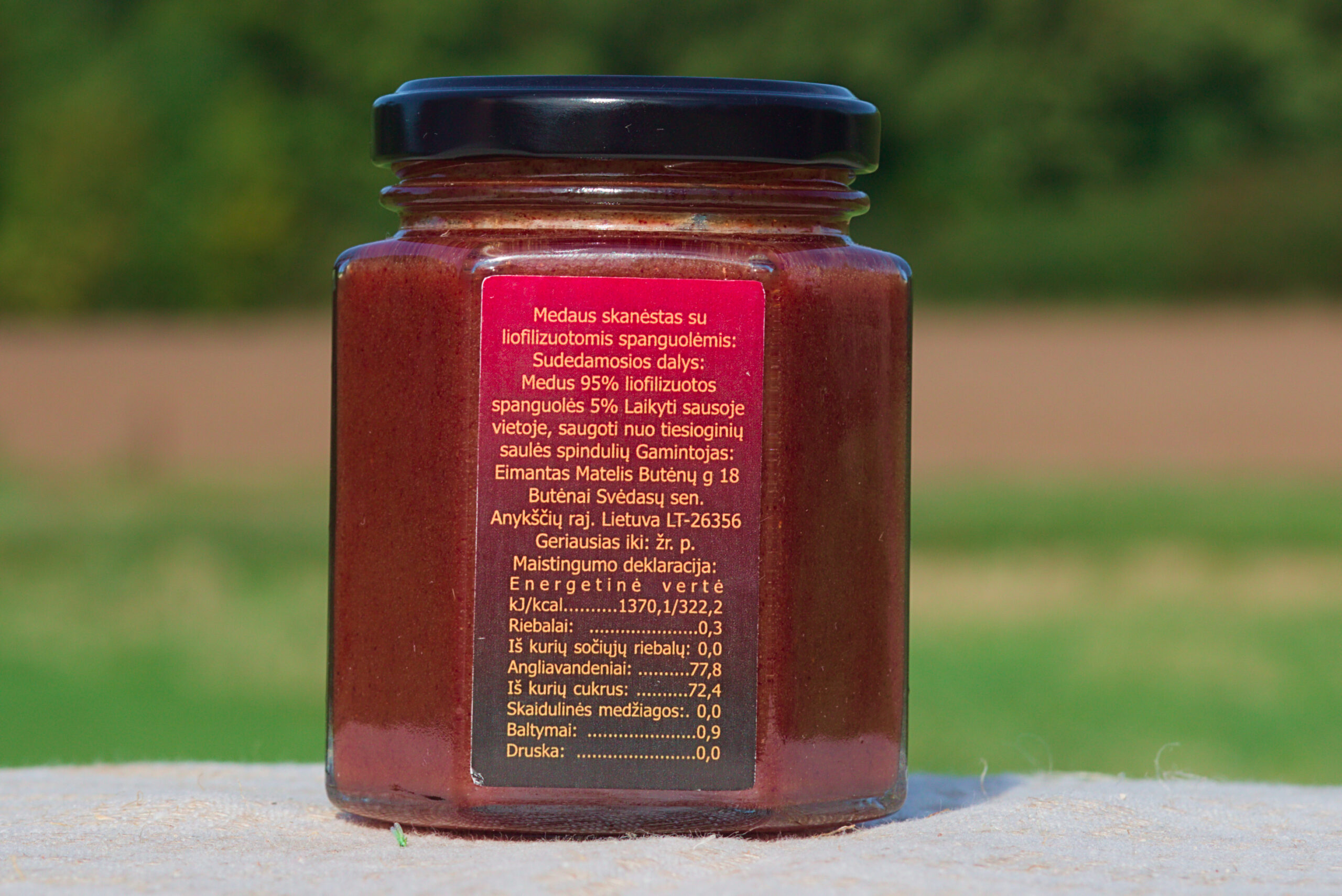 Sudėtis: medus (95%), liofilizuotuos spanguolės (5%).