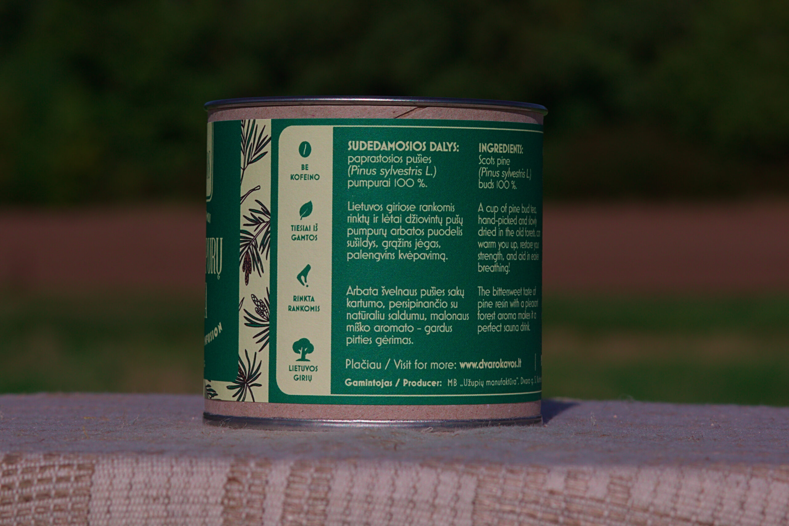 Rankomis rinkti ir lėtai džiovinti pušų pumpurai. Švelnus pušies sakų kartumas persipina su natūraliu saldumu. Arbatos gėrimo ritualą lydi malonus miško aromatas.